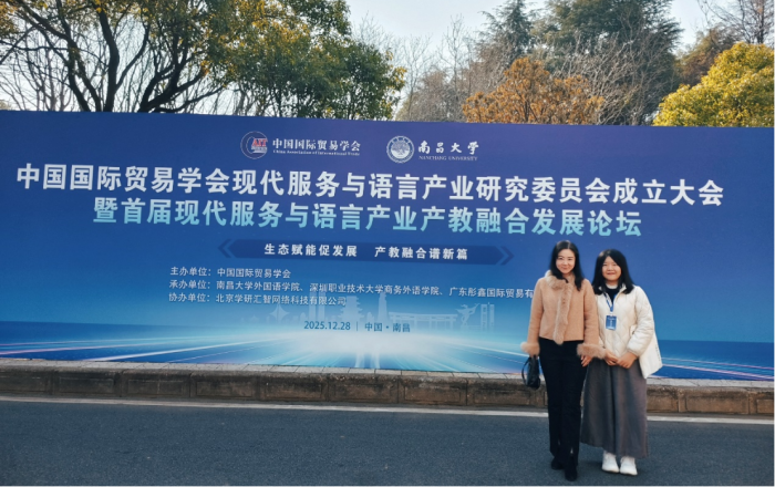 2025年12月28日,中国国际贸易学会现代服务与语言产业研究委员会成立大会暨首届现代服务与语言产业产教融合发展论坛在南昌大学隆重举行,本次论坛由中国国际贸易学会主办,南昌大学谈球吧承办。谈球吧副经理吕晓敏作为中国国际贸易学会现代服务与语言产业研究委员会常务理事受邀参加此次会议,外语系主任胡楠随行参会。