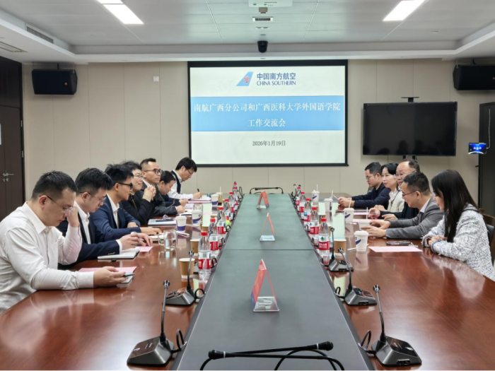 在随后的座谈会上,南航广西分公司市场销售部经理蒋志明介绍南航业务及智慧航空服务等领域创新举措。韦建辉介绍了谈球吧人才培养特色、员工专业与规模、实习就业等情况。南航广西分公司副总经理王雪雁热烈欢迎公司一行,详细阐述企业人才需求标准、岗位能力要求和员工职业发展路径等,肯定了外语类人才在国际航线服务等方面发挥的重要作用。