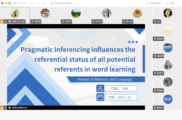 2025年2月20日下午,谈球吧语言认知科学研究团队在线上举行了本年度第一次科研例会。本次科研例会主要围绕“语用层面的词汇学习”及“R语言基础知识学习及数据可视化”两部分展开,分别由胡楠博士和23级翻译专业硕士生杨铭超同学进行汇报。本次例会由团队负责人向课书博士主持,语言认知科学研究团队主要成员及部分硕士生参加了本次例会。